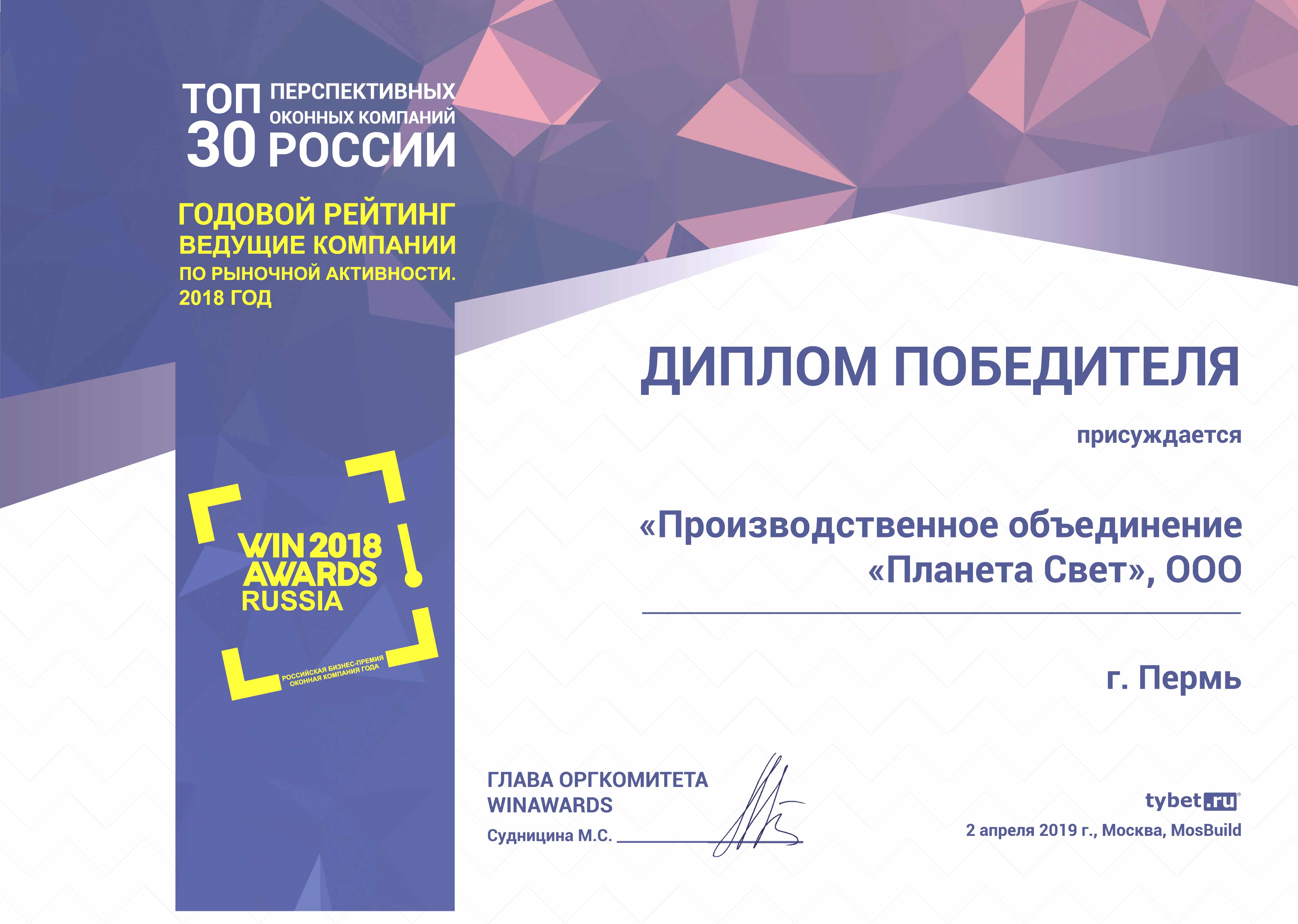 Завод пластиковых окон «Планета Свет» получил диплом победителя рейтинга “ТОП-30 самых динамичных, перспективных оконных Pin-Up Казахстана за 2018 год”.